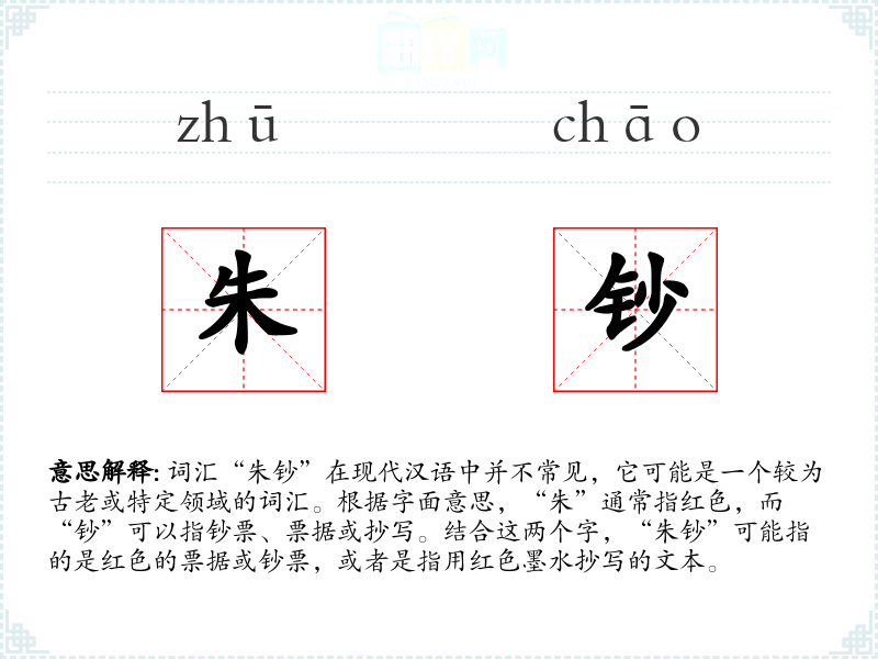 - 理解:朱钞是一个具有历史和文化意义的词汇,虽然在现代汉语中不常用,但在特定的历史和文化研究中具有重要价值。