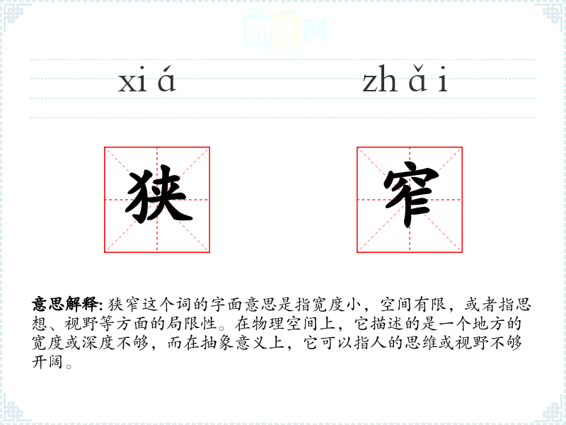 狭窄这个词的字面意思是指宽度小,空间有限,或者指思想、视野等方面的局限性。在物理空间上,它描述的是一个地方的宽度或深度不够,而在抽象意义上,它可以指人的思维或视野不够开阔。