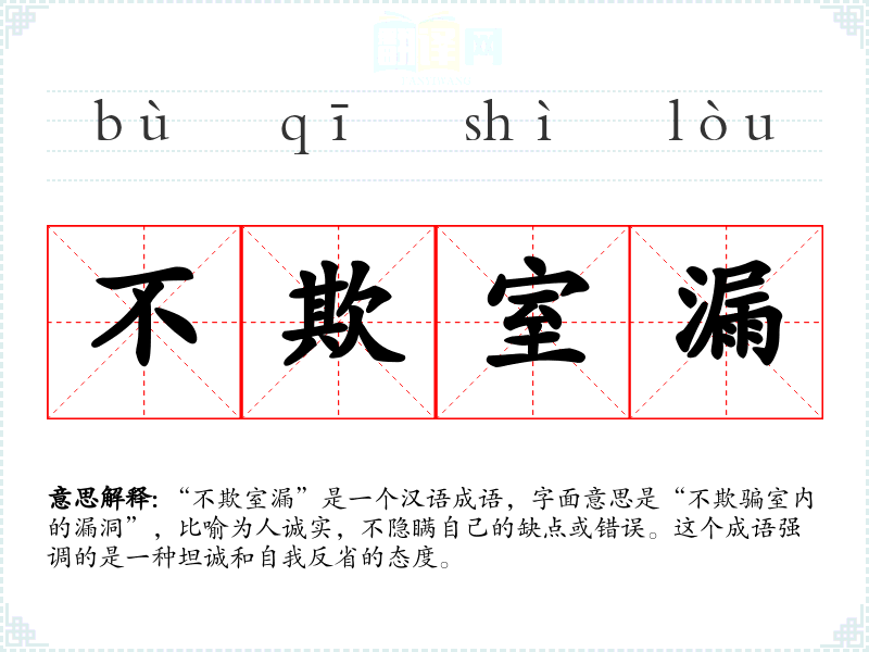 “不欺室漏”是一个汉语成语,字面意思是“不欺骗室内的漏洞”,比喻为人诚实,不隐瞒自己的缺点或错误。这个成语强调的是一种坦诚和自我反省的态度。