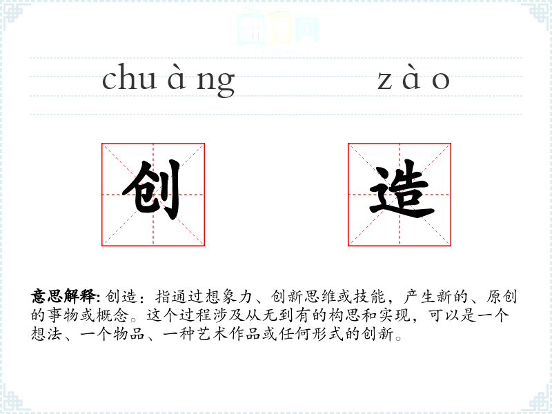 创造:指通过想象力、创新思维或技能,产生新的、原创的事物或概念。这个过程涉及从无到有的构思和实现,可以是一个想法、一个物品、一种艺术作品或任何形式的创新。