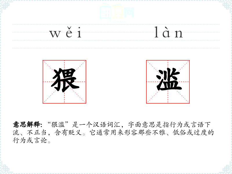 “猥滥”是一个汉语词汇,字面意思是指行为或言语下流、不正当,含有贬义。它通常用来形容那些不雅、低俗或过度的行为或言论。