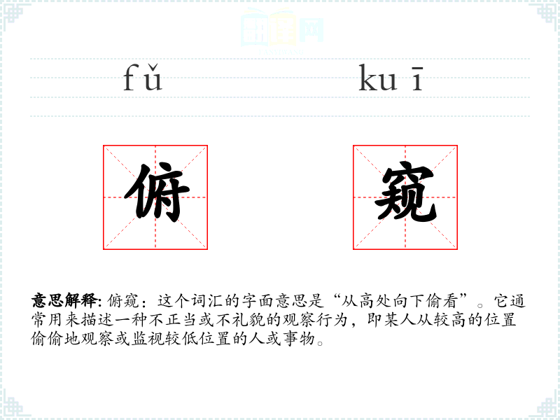 - 反义词:仰视、正视。这些词汇表示正大光明的观察,与“俯窥”的不正当性形成对比。