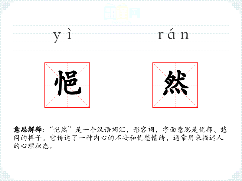 “悒然”是一个汉语词汇,形容词,字面意思是忧郁、愁闷的样子。它传达了一种内心的不安和忧愁情绪,通常用来描述人的心理状态。