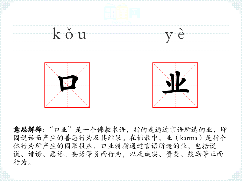 - 反义词:无(因为“口业”是一个特定领域的术语,通常不直接有反义词)