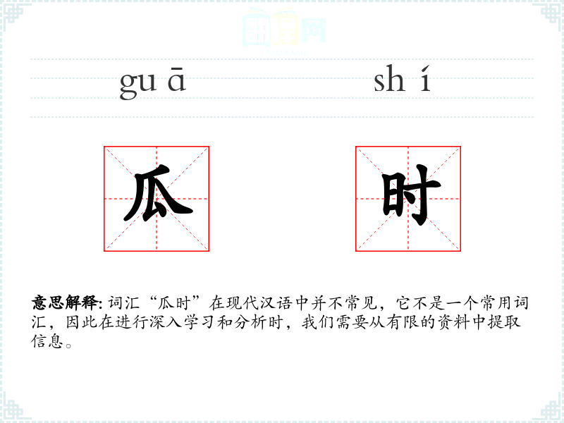 词汇“瓜时”在现代汉语中并不常见,它不是一个常用词汇,因此在进行深入学*和分析时,我们需要从有限的资料中提取信息。