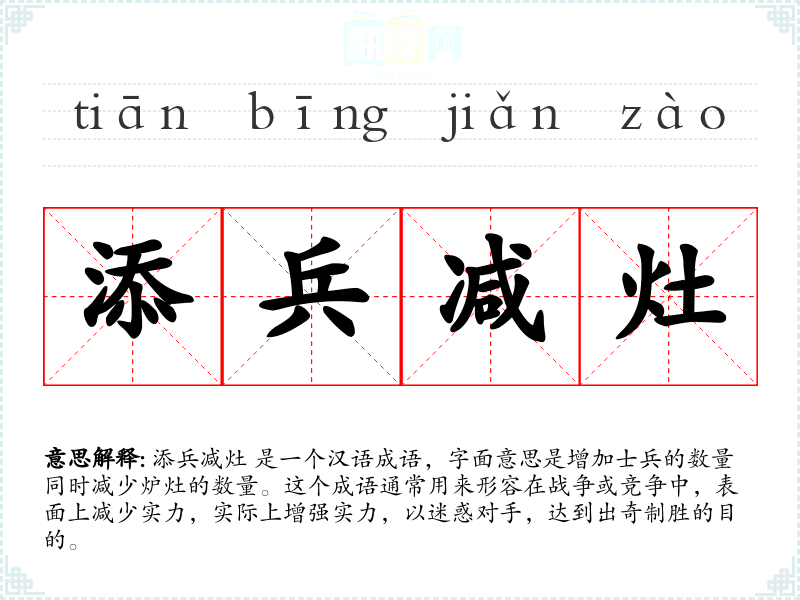 添兵减灶 是一个汉语成语,字面意思是增加士兵的数量同时减少炉灶的数量。这个成语通常用来形容在战争或竞争中,表面上减少实力,实际上增强实力,以迷惑对手,达到出奇制胜的目的。