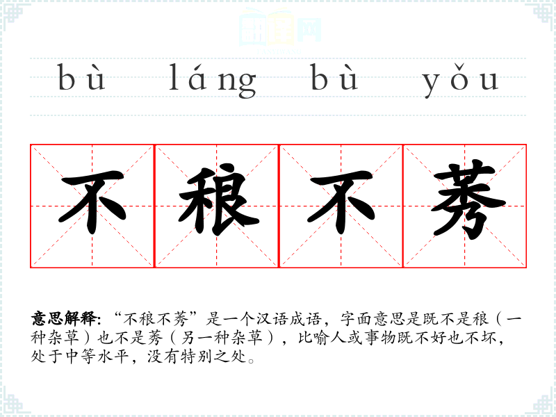 “不稂不莠”是一个汉语成语,字面意思是既不是稂(一种杂草)也不是莠(另一种杂草),比喻人或事物既不好也不坏,处于中等水平,没有特别之处。