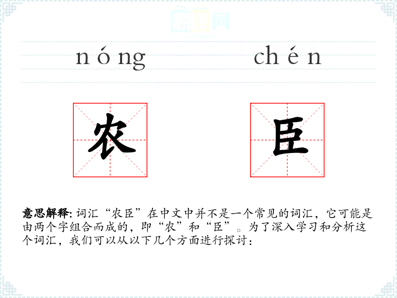 词汇“农臣”在中文中并不是一个常见的词汇,它可能是由两个字组合而成的,即“农”和“臣”。为了深入学*和分析这个词汇,我们可以从以下几个方面进行探讨: