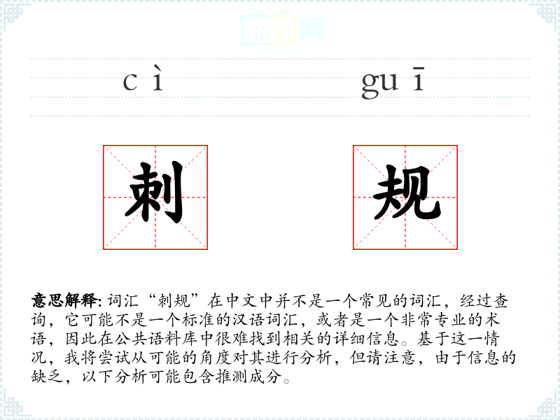 由于“刺规”不是一个常见的词汇,我们无法给出一个确切的基本定义。如果将其拆分为“刺”和“规”两个字,我们可以推测: