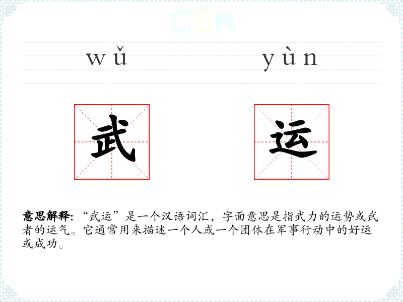 “武运”是一个充满历史和文化内涵的词汇,它不仅描述了军事行动中的好运,还承载了人们对英雄主义和忠诚的敬仰。在学*汉语和理解**文化时,了解“武运”这样的词汇是非常重要的。