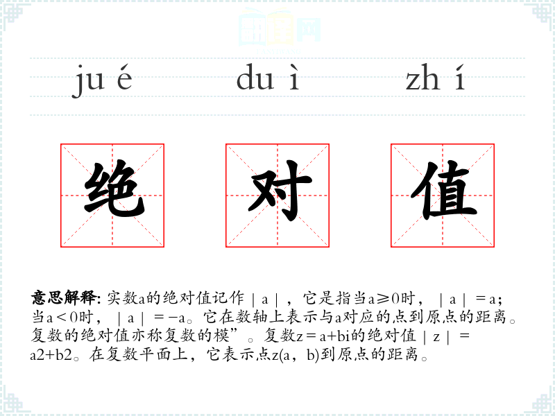1.实数a的绝对值记作|a|,它是指当a≥0时,|a|=a;当a<0时,|a|=-a。它在数轴上表示与a对应的点到原点的距离。复数的绝对值亦称复数的模”。复数z=a+bi的绝对值|z|=a2+b2。在复数平面上,它表示点z(a,b)到原点的距离。