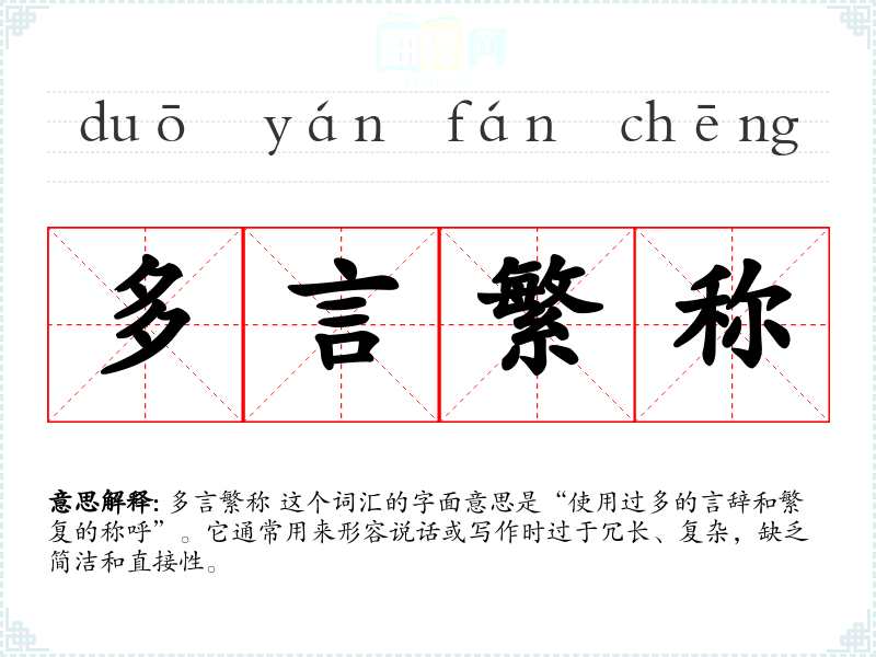 多言繁称 这个词汇的字面意思是“使用过多的言辞和繁复的称呼”。它通常用来形容说话或写作时过于冗长、复杂,缺乏简洁和直接性。
