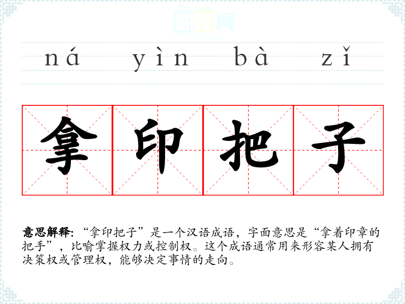 “拿印把子”是一个汉语成语,字面意思是“拿着印章的把手”,比喻掌握权力或控制权。这个成语通常用来形容某人拥有决策权或管理权,能够决定事情的走向。