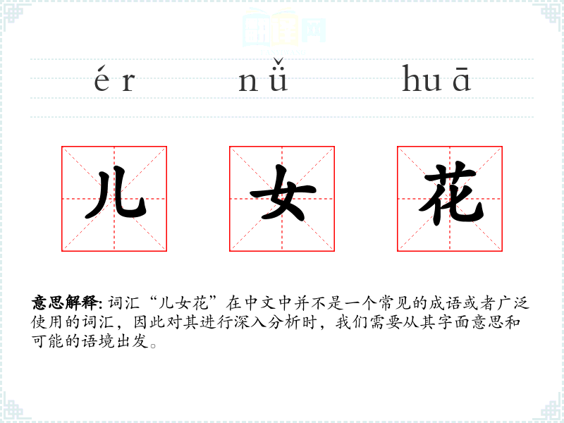 词汇“儿女花”在中文中并不是一个常见的成语或者广泛使用的词汇,因此对其进行深入分析时,我们需要从其字面意思和可能的语境出发。