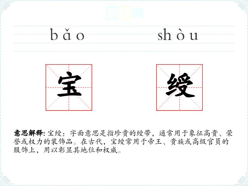 宝绶:字面意思是指珍贵的绶带,通常用于象征高贵、荣誉或权力的装饰品。在古代,宝绶常用于帝王、贵族或高级官员的服饰上,用以彰显其地位和权威。