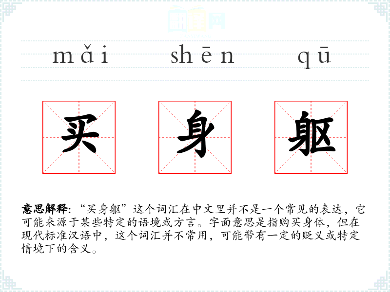 “买身躯”这个词汇在中文里并不是一个常见的表达,它可能来源于某些特定的语境或方言。字面意思是指购买身体,但在现代标准汉语中,这个词汇并不常用,可能带有一定的贬义或特定情境下的含义。