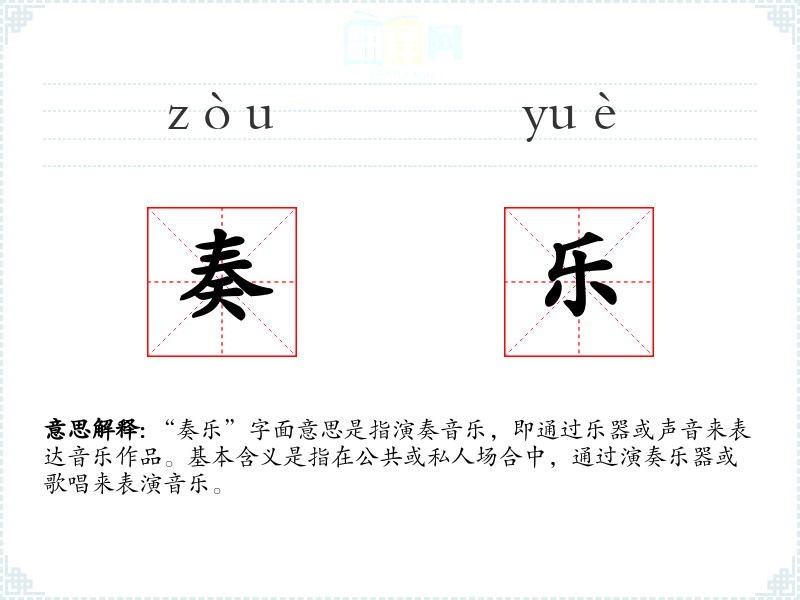 “奏乐”字面意思是指演奏音乐,即通过乐器或声音来表达音乐作品。基本含义是指在公共或私人场合中,通过演奏乐器或歌唱来表演音乐。