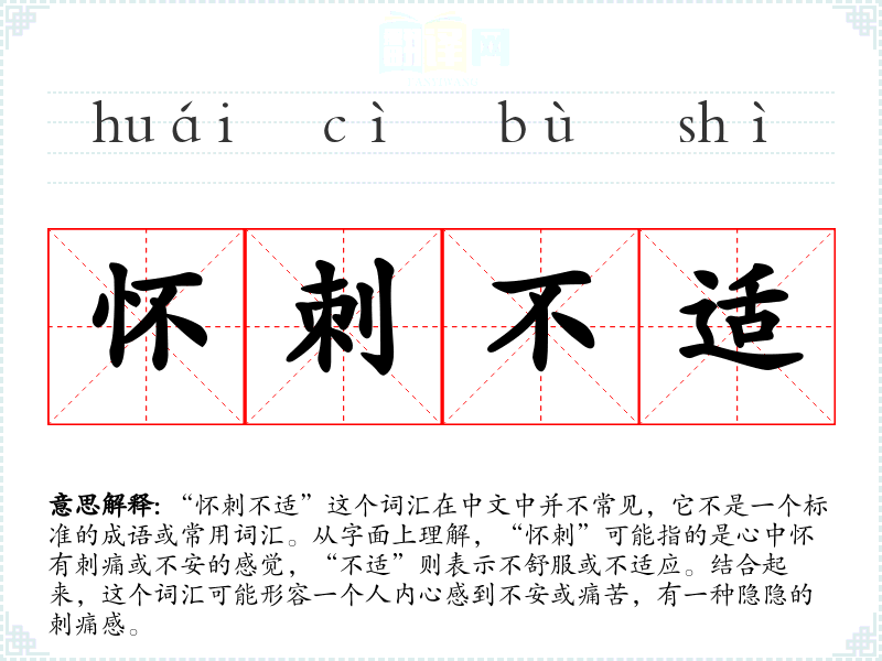 由于“怀刺不适”不是一个常见词汇,它在不同语言或文化中的对应词汇可能不太明显。在英语中,可能用“feeling uneasy”或“inner turmoil”来表达类似的情感。