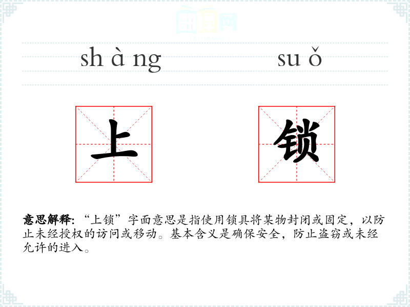 “上锁”字面意思是指使用锁具将某物封闭或固定,以防止未经授权的访问或移动。基本含义是确保安全,防止盗窃或未经允许的进入。