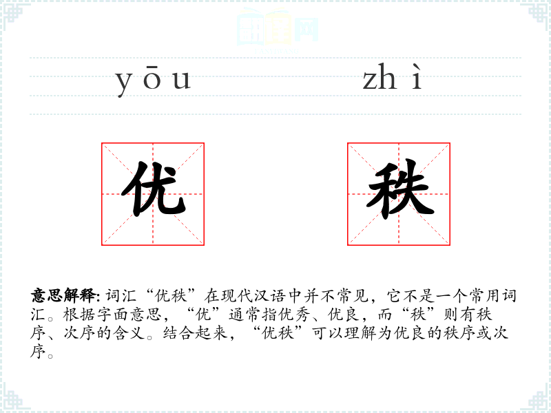 - 词源:“优”和“秩”都是古代汉语词汇,“优”源自“优秀”,“秩”源自“秩序”。