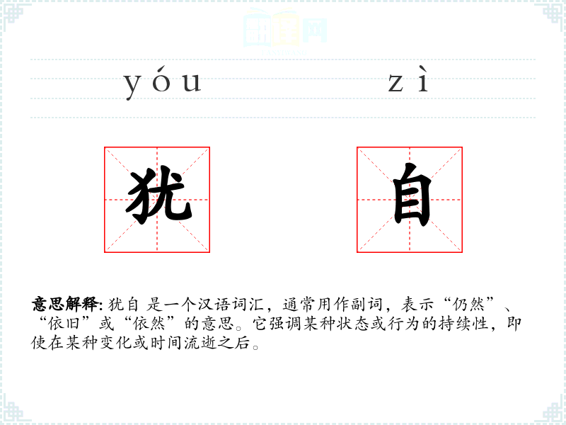 犹自 是一个汉语词汇,通常用作副词,表示“仍然”、“依旧”或“依然”的意思。它强调某种状态或行为的持续性,即使在某种变化或时间流逝之后。