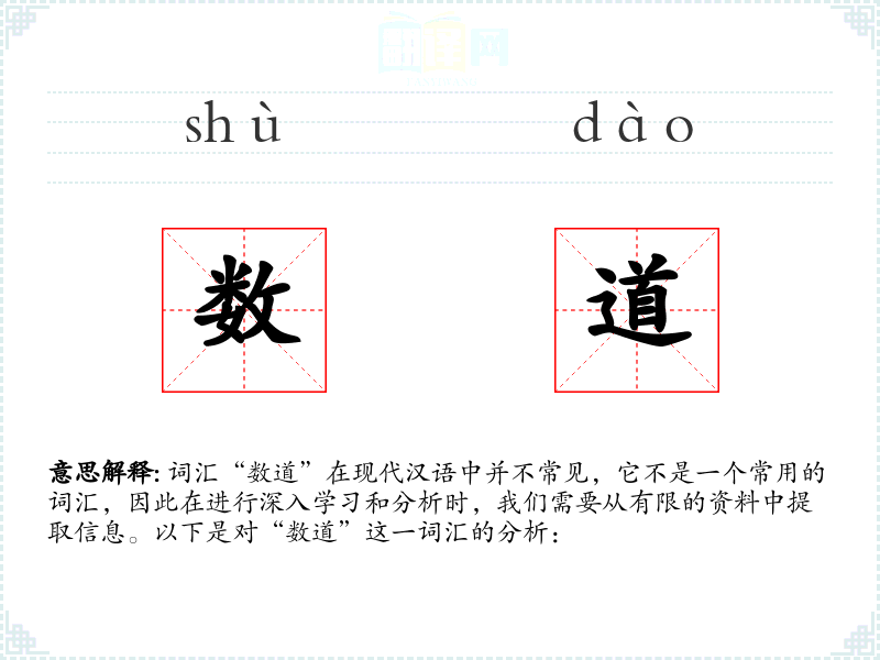 由于“数道”不是一个常用词汇,它在不同语言或文化中的对应词汇及其使用情况不明确。