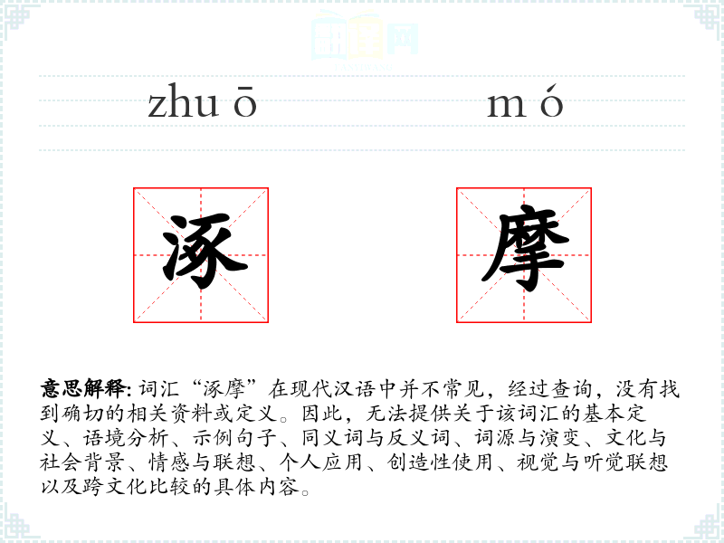 由于“涿摩”不是一个已知的词汇,我将从最契合的角度进行分析,即假设它可能是一个特定领域或方言中的词汇,或者是一个拼写错误或打字错误。在这种情况下,我们可以推测它可能是一个特定地区或社群中使用的词汇,但由于缺乏具体信息,我们无法进一步分析其含义或用法。