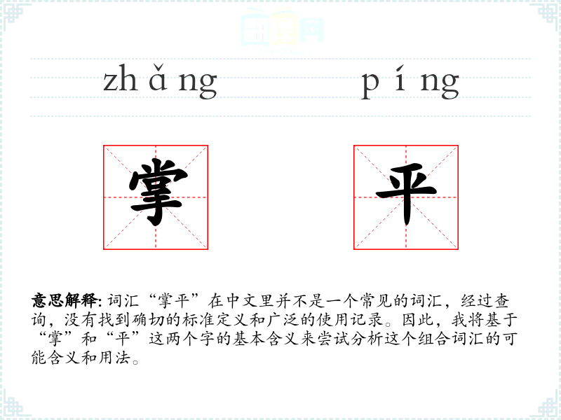 词汇“掌平”在中文里并不是一个常见的词汇,经过查询,没有找到确切的标准定义和广泛的使用记录。因此,我将基于“掌”和“平”这两个字的基本含义来尝试分析这个组合词汇的可能含义和用法。