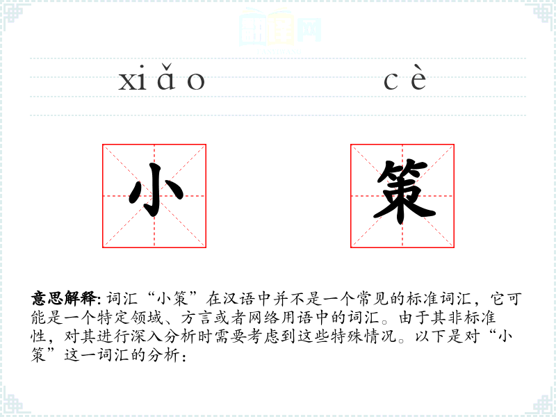 词汇“小策”在汉语中并不是一个常见的标准词汇,它可能是一个特定领域、方言或者网络用语中的词汇。由于其非标准性,对其进行深入分析时需要考虑到这些特殊情况。以下是对“小策”这一词汇的分析: