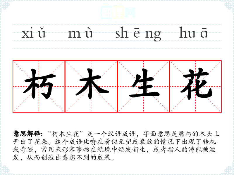 在英语中,类似的表达可能是“a phoenix rising from the ashes”(凤凰涅槃),它也传达了从毁灭中重生的概念,但在文化内涵和象征意义上与“朽木生花”有所不同。