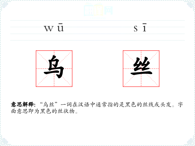 “乌丝”一词在汉语中通常指的是黑色的丝线或头发。字面意思即为黑色的丝状物。