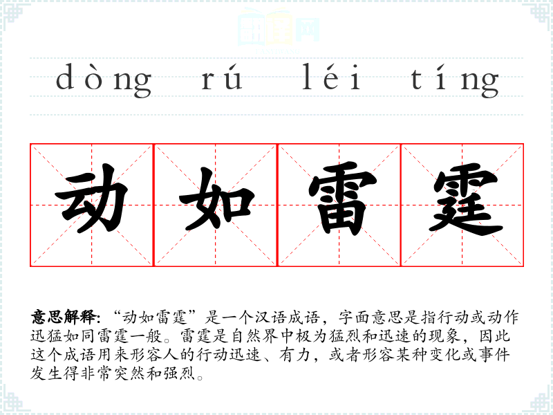 “动如雷霆”这个成语源自**古代对自然现象的观察和比喻。雷霆作为一种自然现象,自古以来就被人们用来形容力量和速度。这个成语在古代文献中有所记载,随着时间的推移,其使用范围和语境逐渐扩大。