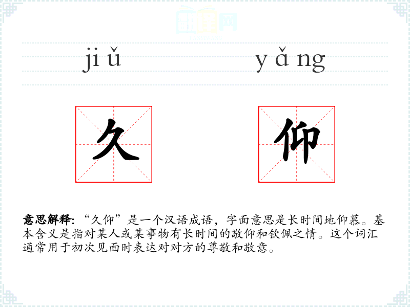 “久仰”是一个汉语成语,字面意思是长时间地仰慕。基本含义是指对某人或某事物有长时间的敬仰和钦佩之情。这个词汇通常用于初次见面时表达对对方的尊敬和敬意。
