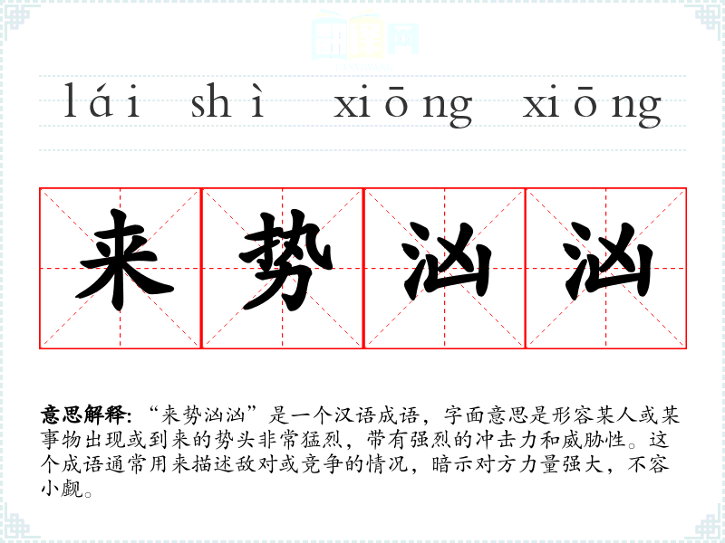 “来势汹汹”是一个汉语成语,字面意思是形容某人或某事物出现或到来的势头非常猛烈,带有强烈的冲击力和威胁性。这个成语通常用来描述敌对或竞争的情况,暗示对方力量强大,不容小觑。