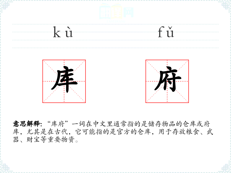 “库府”一词在中文里通常指的是储存物品的仓库或府库,尤其是在古代,它可能指的是官方的仓库,用于存放粮食、武器、财宝等重要物资。