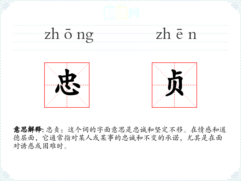 忠贞:这个词的字面意思是忠诚和坚定不移。在情感和道德层面,它通常指对某人或某事的忠诚和不变的承诺,尤其是在面对诱惑或困难时。