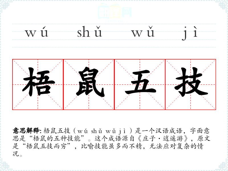 梧鼠五技(wú shǔ wǔ jì)是一个汉语成语,字面意思是“梧鼠的五种技能”。这个成语源自《庄子·逍遥游》,原文是“梧鼠五技而穷”,比喻技能虽多而不精,无法应对复杂的情况。