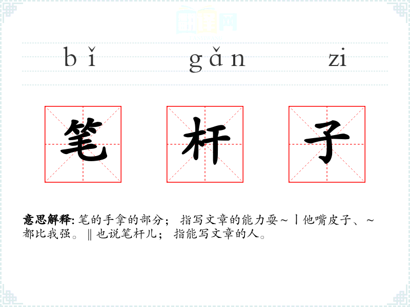 笔的手拿的部分; 指写文章的能力耍~ㄧ他嘴皮子、~都比我强。‖也说笔杆儿; 指能写文章的人。