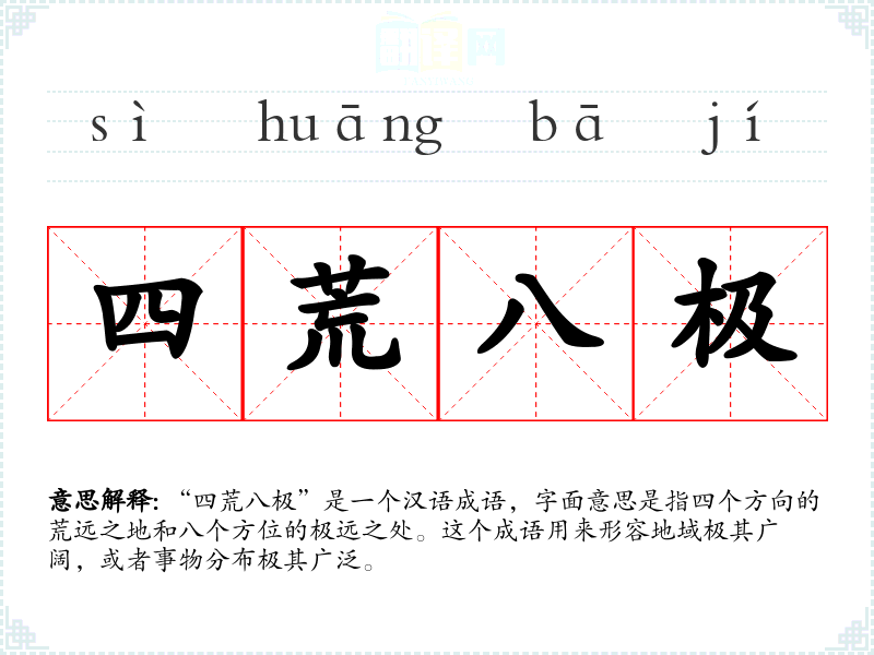 “四荒八极”是一个汉语成语,字面意思是指四个方向的荒远之地和八个方位的极远之处。这个成语用来形容地域极其广阔,或者事物分布极其广泛。