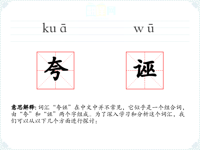 词汇“夸诬”在中文中并不常见,它似乎是一个组合词,由“夸”和“诬”两个字组成。为了深入学习和分析这个词汇,我们可以从以下几个方面进行探讨: