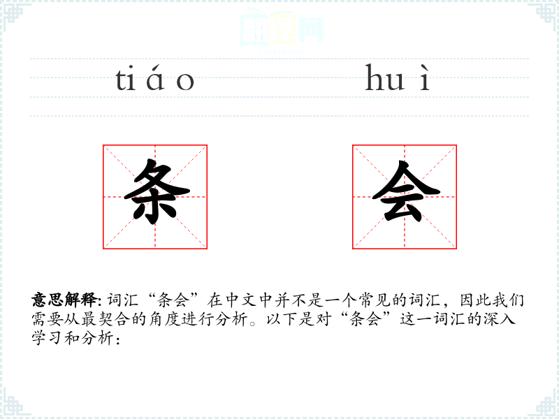 “条会”这个词汇在中文中并不常见,它可能是一个特定领域或方言中的词汇。根据字面意思,“条”通常指条状物或条款,“会”可以指会议或集合。因此,“条会”可能指的是某种形式的会议或集合,其中讨论或处理的是一系列的条款或条状物。
