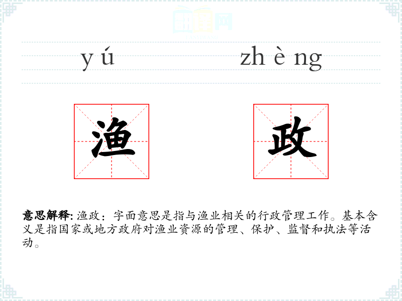 渔政:字面意思是指与渔业相关的行政管理工作。基本含义是指国家或地方政府对渔业资源的管理、保护、监督和执法等活动。