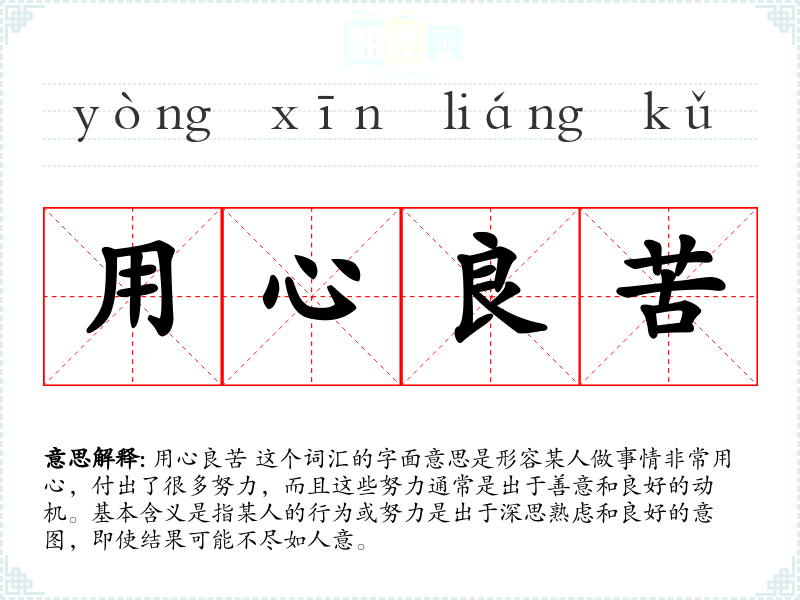 用心良苦 这个词汇的字面意思是形容某人做事情非常用心,付出了很多努力,而且这些努力通常是出于善意和良好的动机。基本含义是指某人的行为或努力是出于深思熟虑和良好的意图,即使结果可能不尽如人意。