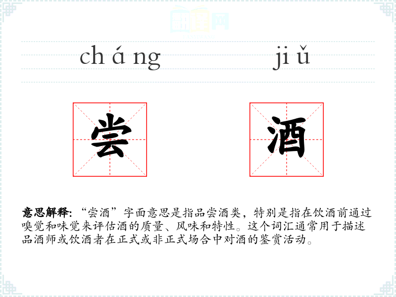 “尝酒”字面意思是指品尝酒类,特别是指在饮酒前通过嗅觉和味觉来评估酒的质量、风味和特性。这个词汇通常用于描述品酒师或饮酒者在正式或非正式场合中对酒的鉴赏活动。