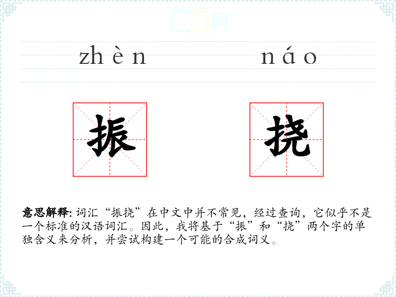 词汇“振挠”在中文中并不常见,经过查询,它似乎不是一个标准的汉语词汇。因此,我将基于“振”和“挠”两个字的单独含义来分析,并尝试构建一个可能的合成词义。