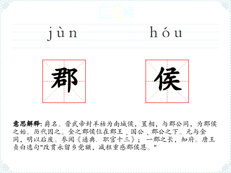 1.爵名。晋武帝封羊祜为南城侯,置相,与郡公同,为郡侯之始。历代因之。金之郡侯位在郡王﹑国公﹑郡公之下。元与金同,明以后废。参阅《通典.职官十三》; 一郡之长,知府。唐王贞白逸句"改贯永留乡党额,减租重感郡侯恩。"
