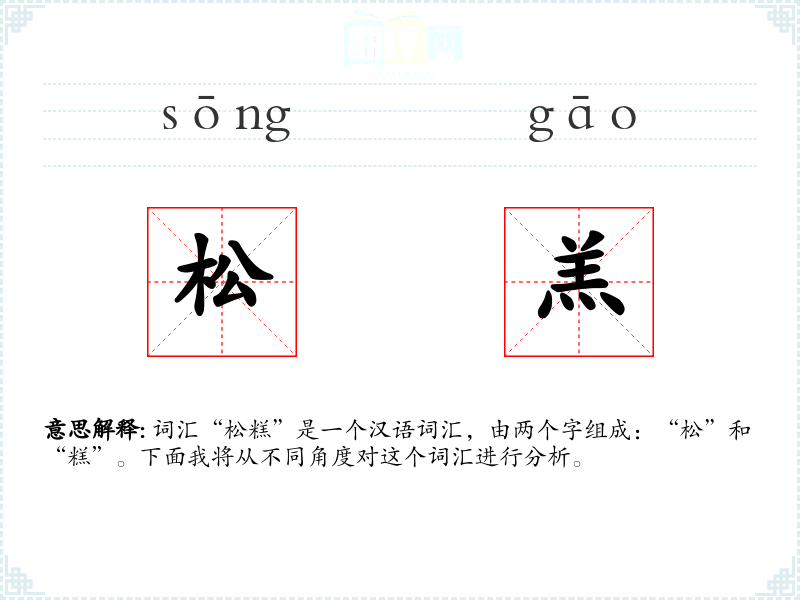 词汇“松糕”是一个汉语词汇,由两个字组成:“松”和“糕”。下面我将从不同角度对这个词汇进行分析。
