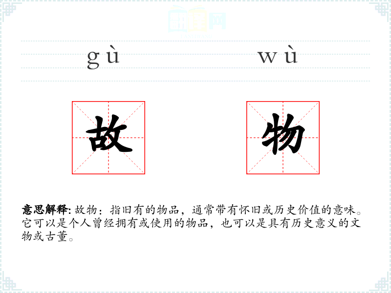 故物:指旧有的物品,通常带有怀旧或历史价值的意味。它可以是个人曾经拥有或使用的物品,也可以是具有历史意义的文物或古董。