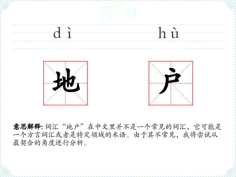 词汇“地户”在中文里并不是一个常见的词汇,它可能是一个方言词汇或者是特定领域的术语。由于其不常见,我将尝试从最契合的角度进行分析。