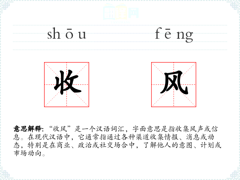 “收风”一词的词源较为直接,由“收”和“风”两个字组成。在古代,风可以比喻消息或传言,因此“收风”即指收集这些消息。随着时间的推移,这个词的含义逐渐固定为收集情报或信息。